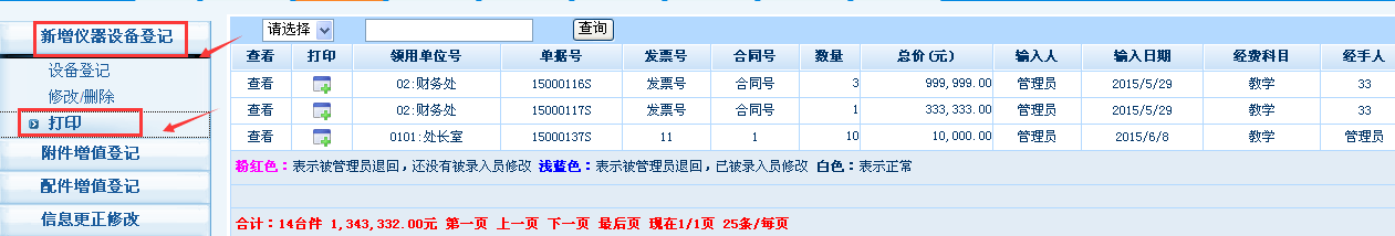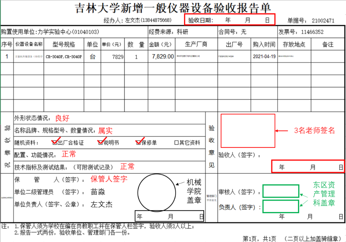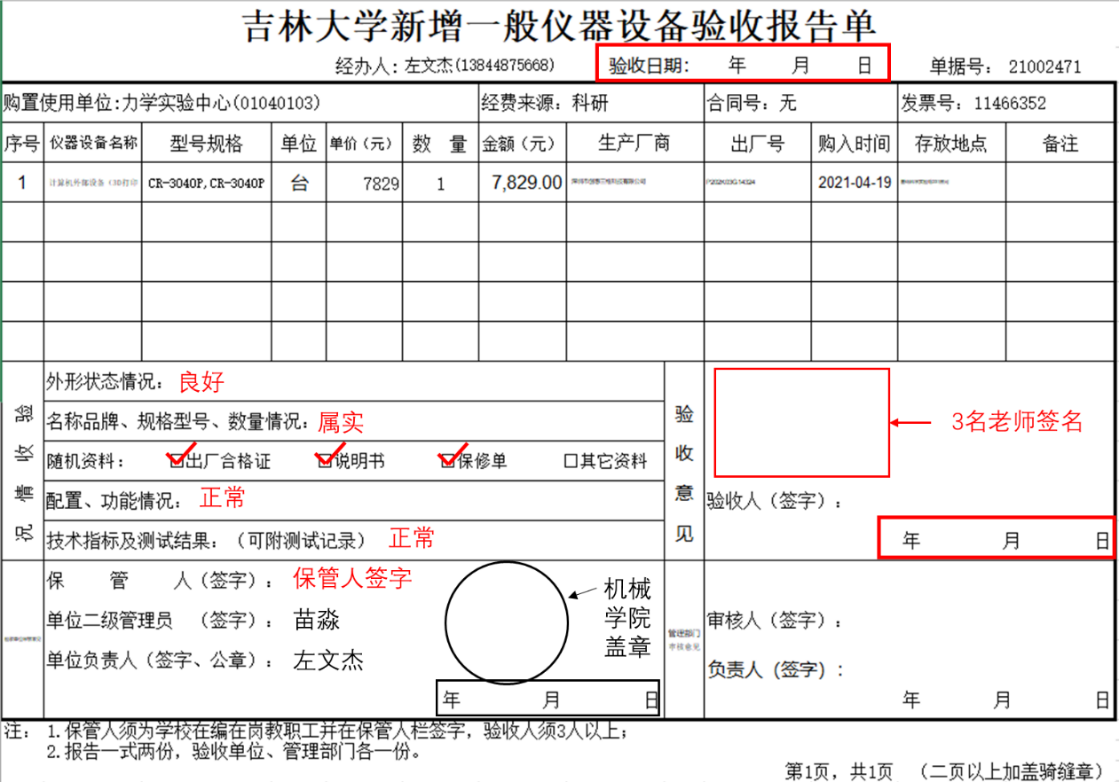 机械公司二级管理员苗淼(机械材料馆506)进行初审。初审通过后,点击【验收录入】→【新增设备登记】→【打印】,即可打印“新增仪器设备验收报告单”。