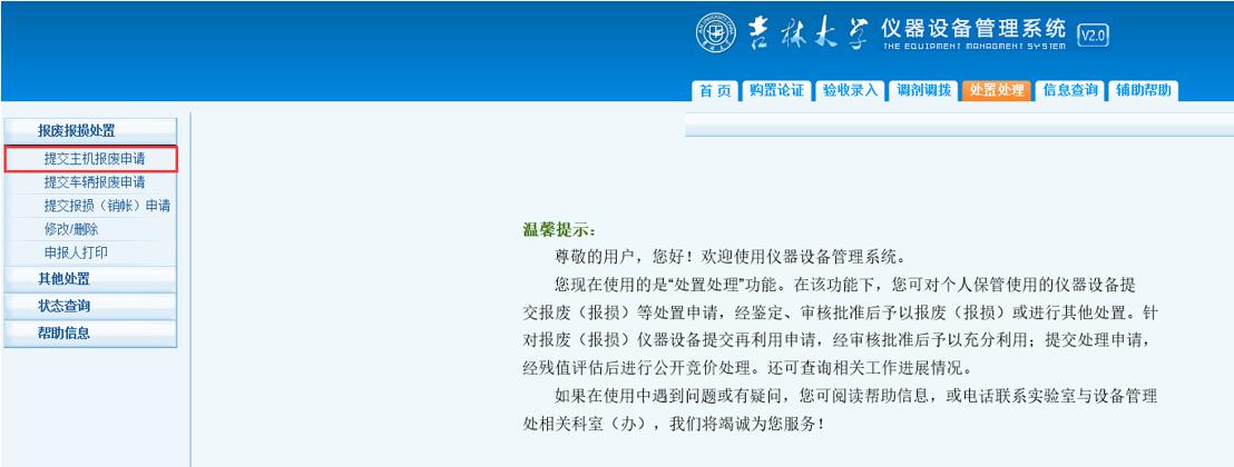点击如图6所示的红框内容,进入【处置处理】界面。进入后先点击【报废报损处置】,然后点击【提交主机报废申请】,开始申请固定资产设备报废。如图7所示。