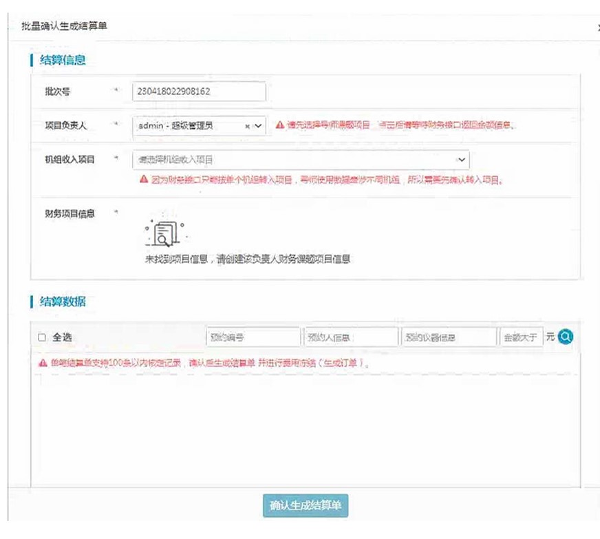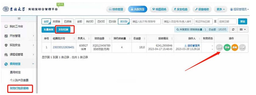 9.预约人和指导老师确认费用之后可以发起结算进行报销,在费用管理找到财务打包及报销,点击发起结算按钮进行财务结算。选择相应的收入项目和结算数据后,点击确认生成计算单按钮。之后点击报销按钮就完成报销操作。