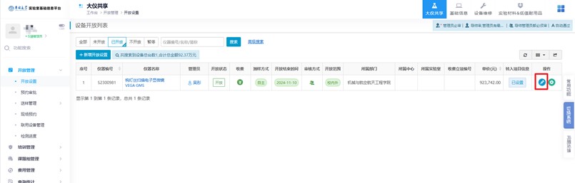 5.这个页面进行仪器开放信息的管理,包括基础设置、自主上机、收费设置。在基础信息中可以选择是否开放仪器,以及是否收费,同时可以设置仪器的开放时间段。在自主上机中,可以选择审核方式,开放范围等信息。在收费设置中可以选择计费方式,收费标准等信息,信息更改后需要进行审批通过。