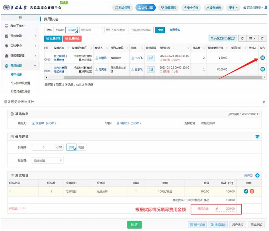 8.待导师也审核完毕员工提交的预约信息后,设备管理员需要完成费用的核定。在费用核定窗口中可以根据实际情况,增减实验费用,费用核定后等待预约人在前台个人中心确认费用。